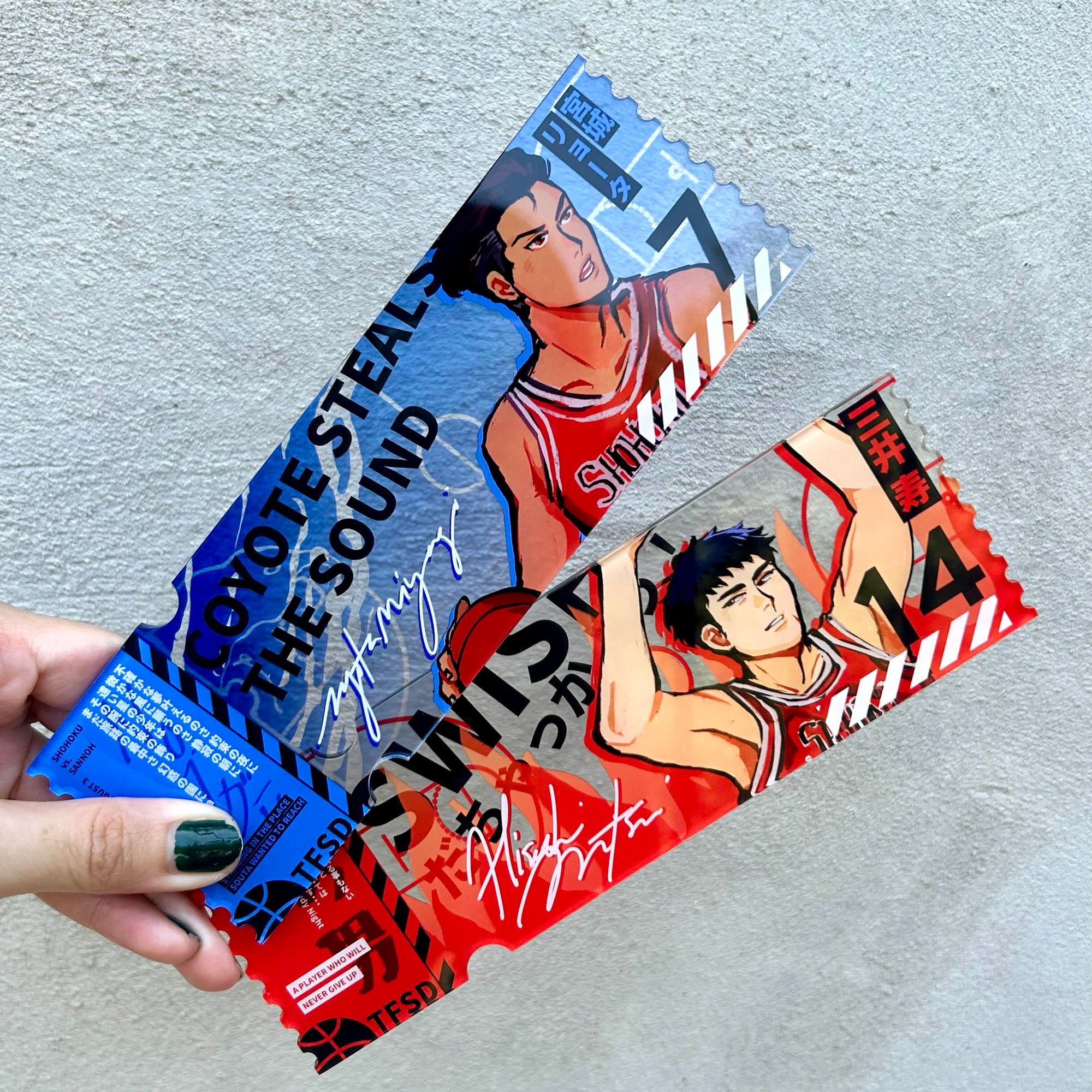 Acrylic Tickets featuring Miyagi and Mitsui!! Measures at 7in in length, double sided with the same design!